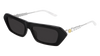Vintage feminine story inspired by jewellery world. Retrò rectangular front in acetate and metal temples with Swarovski crystals. Temples with Gucci interlocking logo and mother of pearl end tips, providing a contrast with the exaggerated oversized front. Eclectic plastics and crystals are softened by the sage and lilac tones of the lenses.